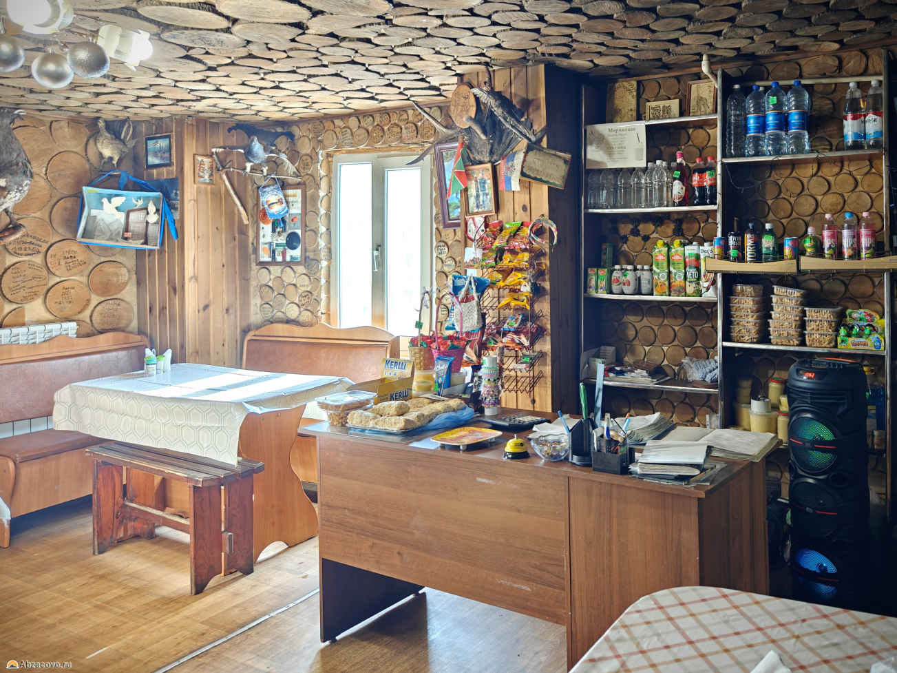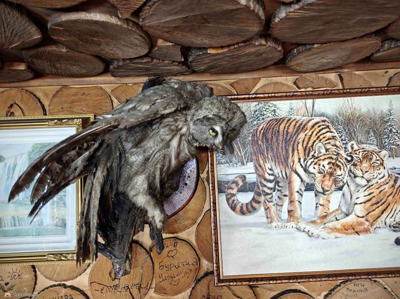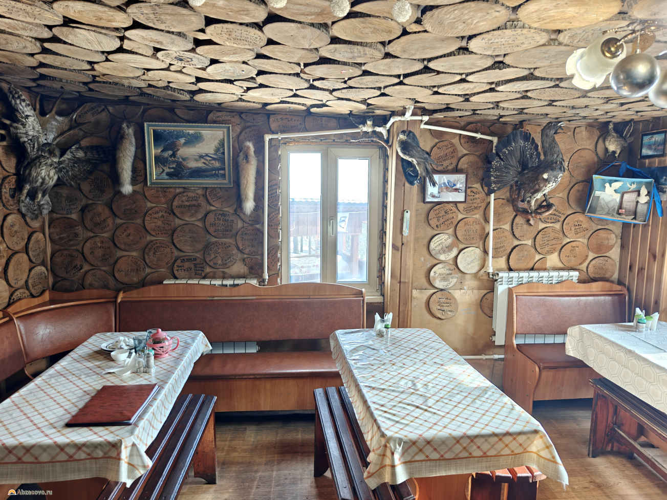 Внутри стилистика охотничьей избы: стены обделаны бревенчатыми спилами, на них — чучела животных (сова, орёл, куропатка) и оленьи рога. На каждом бревне посетители оставляют надписи с названиями своих городов и датами визита.