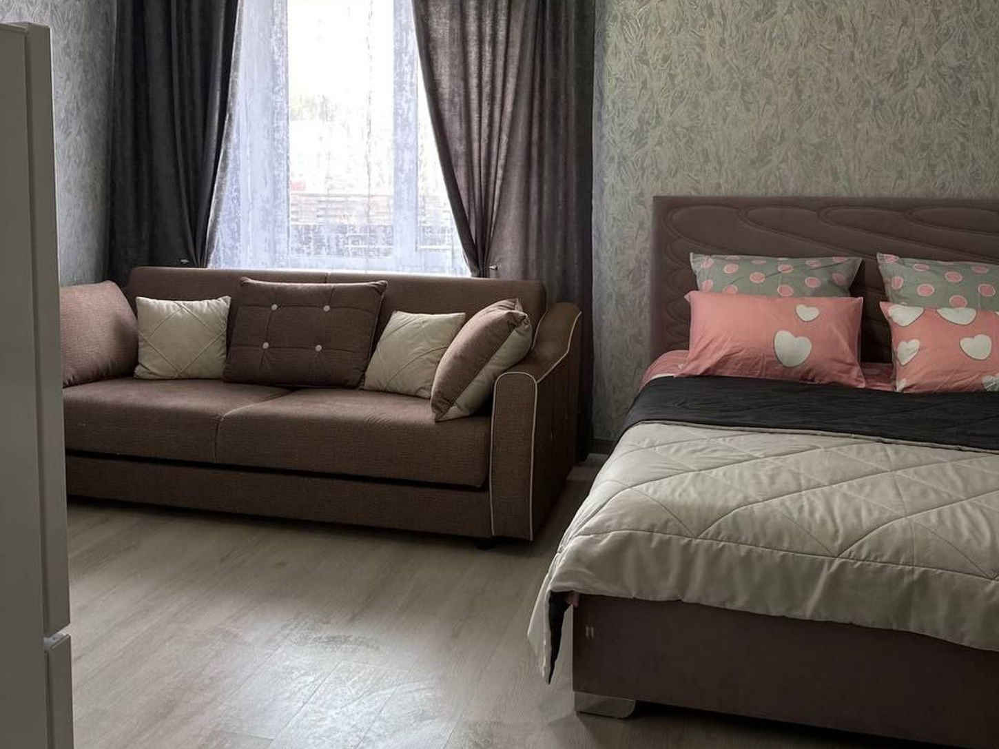 Вместимость до 4 человек (двуспальная кровать, раскладной диван на двоих и односпальная кровать). Уютный интерьер в тёмных и коричневых тонах.