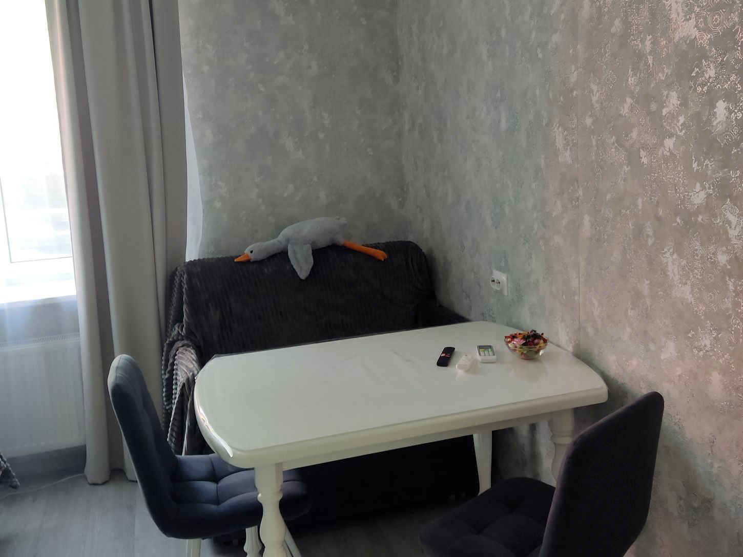 Вместимость до 4 человек (двуспальная кровать и раскладной диван). 1 этаж. Сдержанный интерьер в серых тонах.