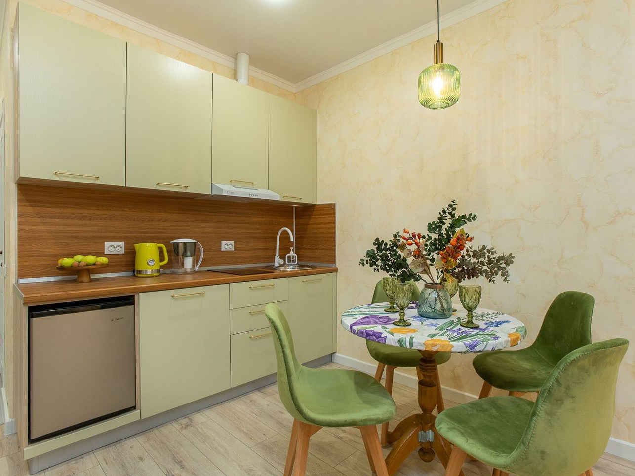 Вместимость до 4 человек (двуспальная кровать, раскладной диван). 2 этаж. Тёплый интерьер в зелёных и кремовых тонах. Отдельная спальная комната.